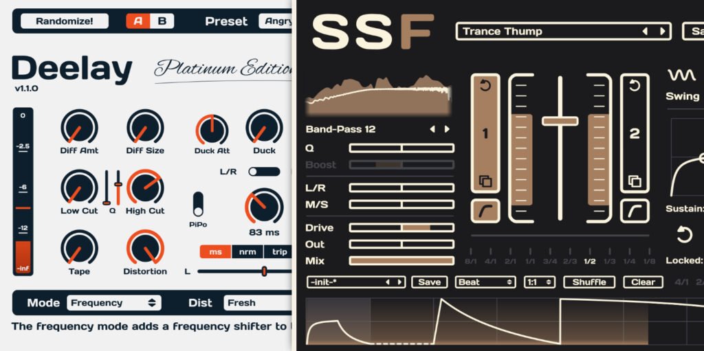 Deelay PE and SSF in one cost-effective bundle. Build complex rhythmic ideas and evolving textures with feature-rich delay paired with pattern-driven filtering. Both include built-in randomization to spark ideas fast and break creative blocks. For more details on each plugin, press the images below.
