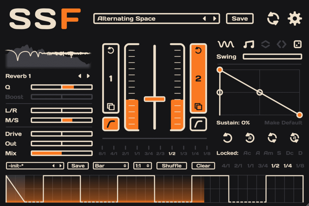 Plugins with built-in modulation too often require you to draw the desired modulation shape by creating and dragging nodes around, usually making complex pattern creation painstakingly time-consuming. What SSF excels at is creating catchy beat-synced modulation patterns with incredible ease. Realizing a rhythm idea in your head into modulation takes seconds, and refining the results spares you from navigating a sea of automation nodes.